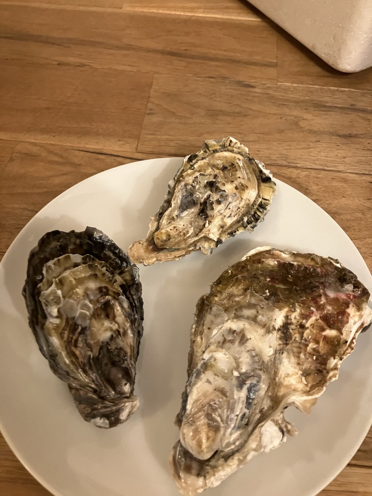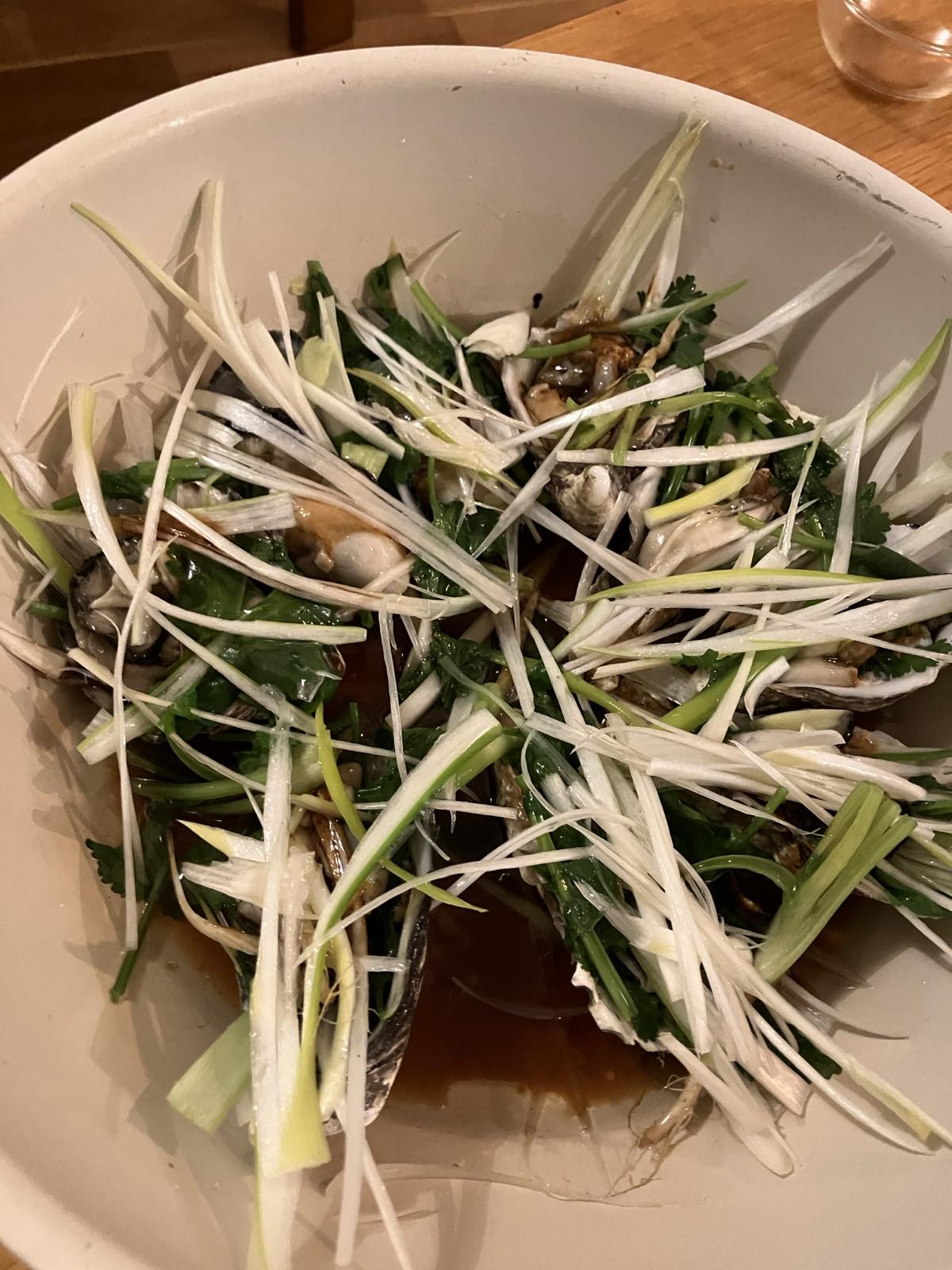 2 weeks ago, I was invited by friends. I fully enjoyed more than a dozen oysters from three different Japanese oyster-producing areas. Biggest one was from Itoshima,black one was from Chiba and small one was from Miyagi.They bought them from their friend who manages seafood related business so that the quality was perfect.The raw one just with fresh lemon squeeze ,the steamed one with green onion and peanuts oil.